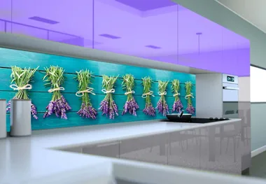 Po pierwsze trwałość. Warto zaznaczyć, że oryginalny lacobel to szkło niehartowane , co oznacza, że nie nadaje się do montażu w miejscach narażonych na wysoką temperaturę, takich jak okolice płyty gazowej. Ze względu na ograniczoną wytrzymałość i wąską gamę kolorystyczną (kilkanaście gotowych kolorów), jego zastosowanie w kuchniach i łazienkach bywa ograniczone. Zdecydowanie lepszym rozwiązaniem jest szkło hartowane, które po docięciu do wymiaru poddaje się lakierowaniu lub nadrukowi. Samo szkło jest odporne na temperaturę do 400°C, a druk światłoutwardzalny do 150°C oraz wilgoć i, dlatego bez obaw można je zamontować nawet bezpośrednio za płytą gazową.